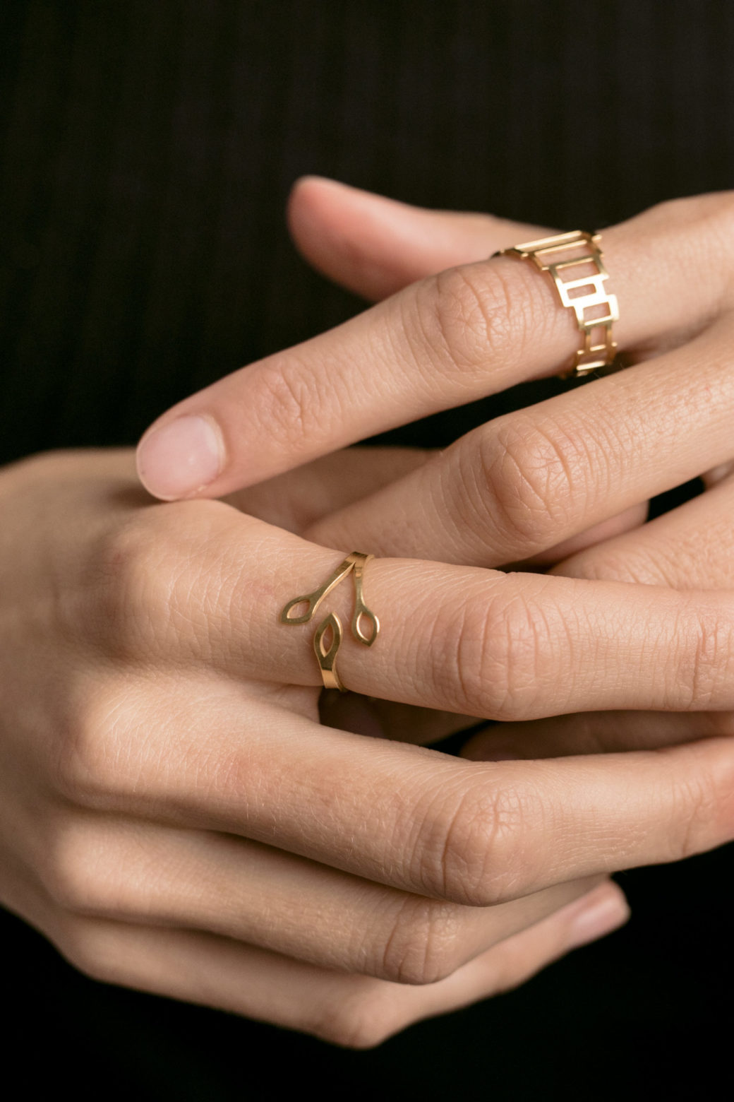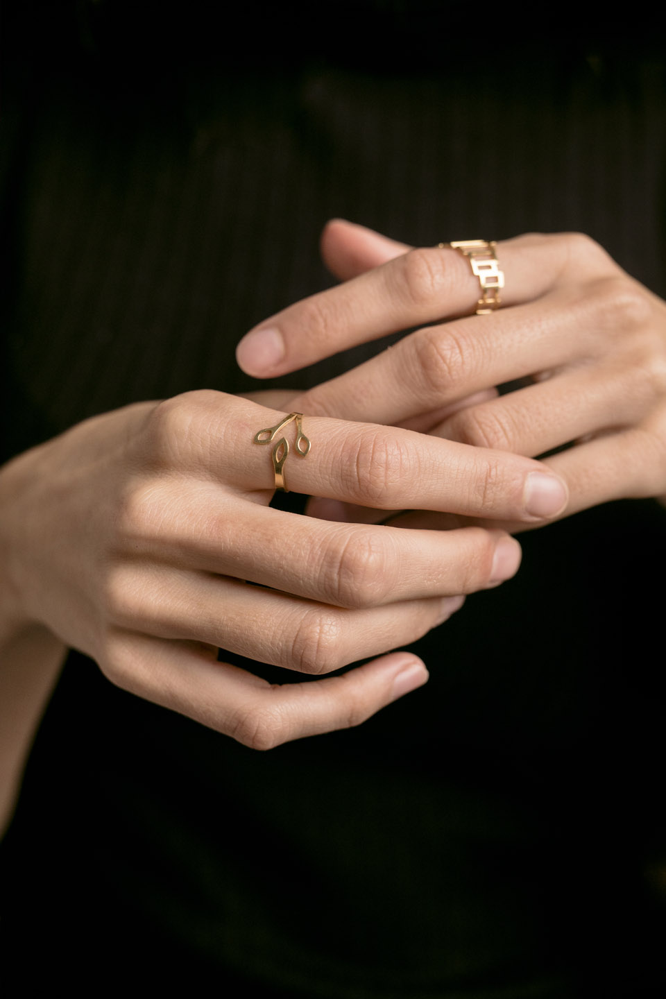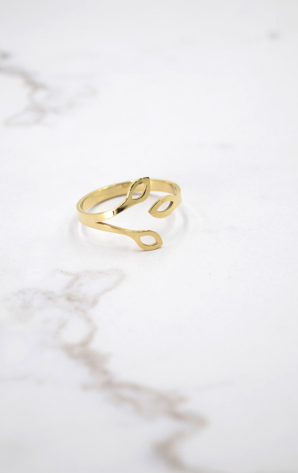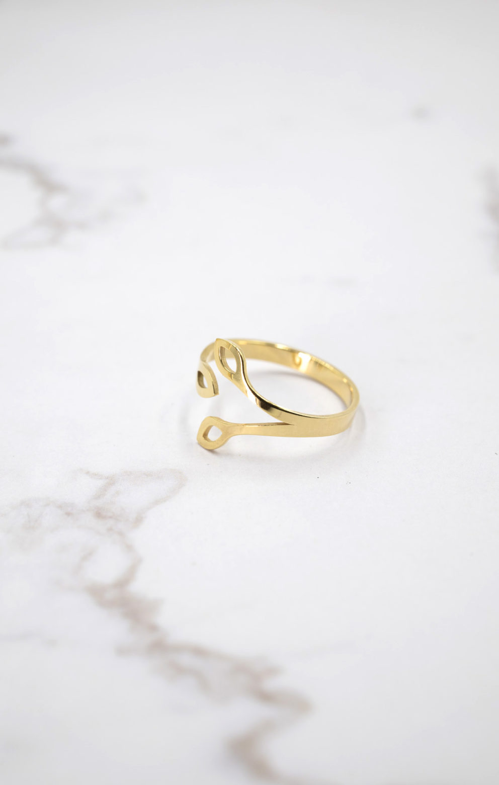 Motivos vegetales desde un punto de vista geométrico. Medidas: 18mm (d) ajustable. Material: Plata 925 chapada en Oro de 24K.